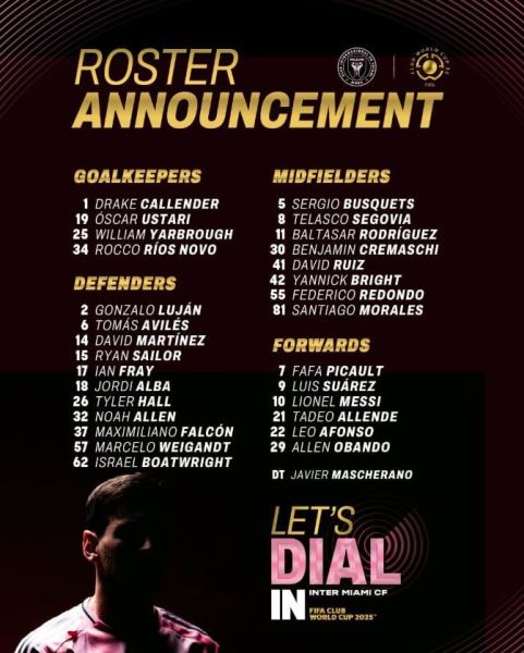 «Интер Майами» в социальной сети X (ранее Twitter) представил свой состав на клубный чемпионат мира-2025, который стартует 15 июня матчем открытия турнира с египетским «Аль-Ахли», передает Sports.kz со ссылкой на Championat.com.