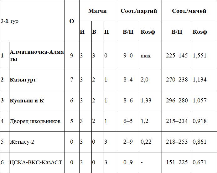 Перед днем отдыха в пятницу, команды провели по три игры. По прежнему «не видит» соперников — ВК «Алматиночка-Алматы». В тринадцати сыгранных встречах у южностоличного коллектива стопроцентный результат. И шансы на то, что во второй половине чемпионата, алматинки растеряют свое преимущество для общей победы в лиге, практически равны нулю. Ну а интрига дивизиона плавно переходит к будущему серебряно-бронзовому противостоянию Юга и Севера. Южноказахстанский «Казыгурт» и североказахстанский «Куаныш и К», накануне украсили тур пятисетовым поединком. А победа на тай-брейке, позволила северянкам в борьбе за второе место, сократить отставание от «Казыгурта» до пяти очков. На выходных обоим клубам предстоит свидание с «Алматиночкой». Помимо этого, южноказахстанкий коллектив, к слову единственный пока кто выиграл целый сет у лидера, закроет тур встречей с хозяевами площадки. Столичный «Дворец школьников» обыграв в первый день тура на тай-брейке «Куаныш и К», является пока автором самой главной неожиданности третьего тура.