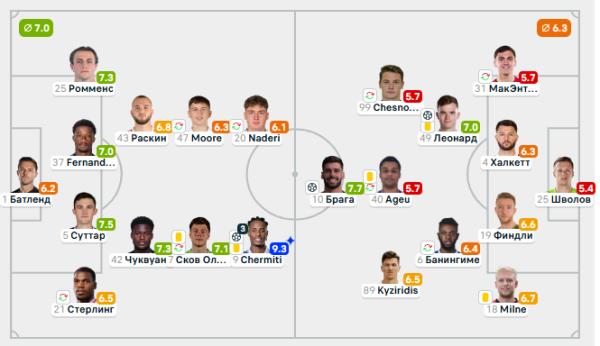 Действия 26-летнего вингера в первой половине встречи в Глазго были оценены в 5.7 балла. Чесноков вышел в стартовом составе и был заменён главным тренером Дереком Макиннесом в перерыве матча при счёте 2:2. Ниже оценку получил только вратарь «Хартса» Александер Шволов — 5.4. Наивысшую оценку в составе команды получил автор гола и голевой передачи Клаудио Брага — 7.7 балла.