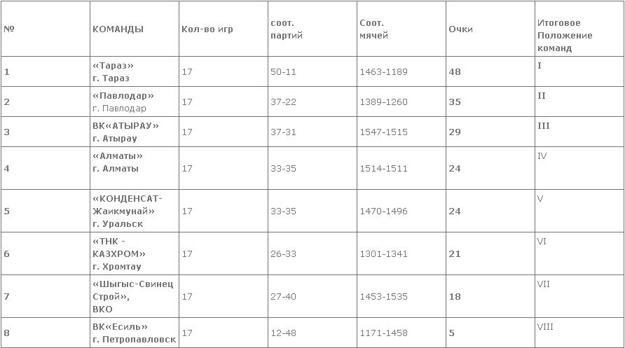 В следующем, уже большом туре настоящая борьба развернется между командами «Алматы» и «Конденсат-Жаикмунай», которые сейчас имеют по 24 очков и идут друг за другом в турнирной таблице. 3 очка разделяют «ТНК «Казхром» и «Шыгыс-Свинец Строй», поэтому между этими командами также может возникнуть интересная гонка.