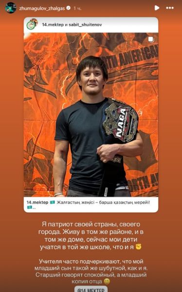 «Я патриот своей страны, своего города. Живу в том же районе и в том же доме, сейчас мои дети учатся в той же школе, что и я. Учителя часто подчеркивают, что мой младший сын такой же шубутной, как и я. Старший, говорят, спокойный, а младший — копия отца», — написал Жумагулов в сториз в Instagram.