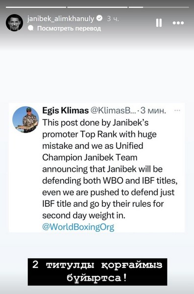 Менеджер «Казахского стиля» Эгис Климас, тем не менее, назвал это «ошибкой» и заверил, что Жанибек будет драться за оба титула. Это же подтвердил и сам Алимханулы — в Instagram Stories он сделал репост заявления Климаса и написал: «Бог даст, защитим два титула».
