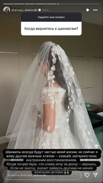 «Шахматы всегда будут частью моей жизни, но сейчас я живу другим важным этапом семьёй, материнством, внутренним восстановлением. Когда почувствую, что снова хочу за доску вернусь. Если не захочу, значит займусь другими не менее важными делами», — ответила Абдумалик в своем инстаграм.