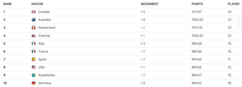 Лидером среди женских сборных впервые стала команда Канады, которая в финале Чемпионата мира 2023 обыграла Италию и завоевала дебютный Кубок Билли Джин Кинг. За Канадой в топ-10 расположились сборные Австралии, Швейцарии, Чехии, Италии, Франции, Испании, США, Казахстана и Германии.