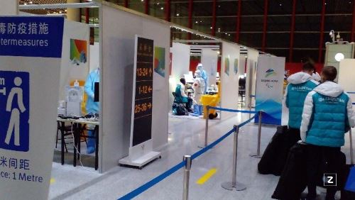 Далее все собираются в зоне ожидания, получают багаж и рассаживаются по автобусам. Представители коньковых видов спорта и часть сотрудников и журналистов едут в отель, расположенный в Пекине, а выступающие в лыжных видах спорта вместе с частью журналистов направились на горнолыжный курорт в пригород столицы — городок Чжанцзякоу.