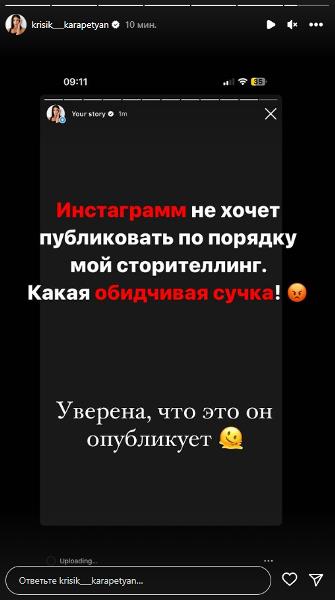 «Инстаграм не хочет публиковать по порядку мой сторителлинг. Какая обидчивая сучка! Уверена, что это он опубликует», — отметила популярная спортсменка, добавив гневный эмодзи.