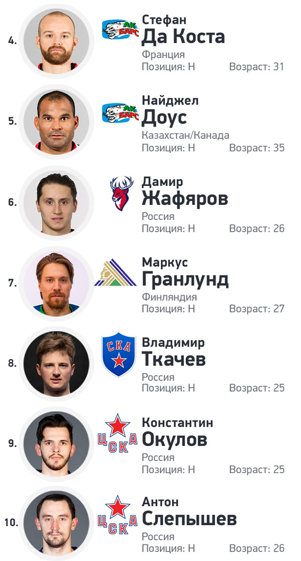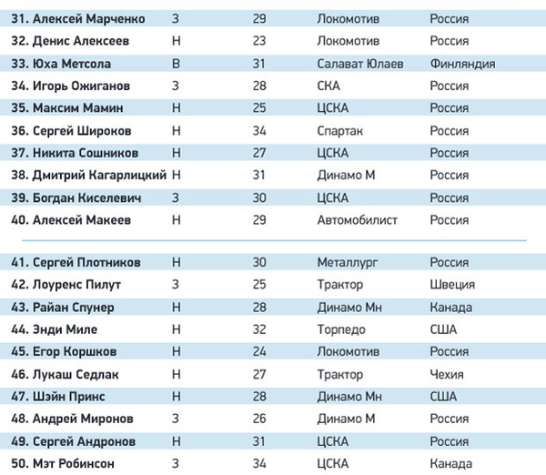 Единственным представителем казахстанского «Барыса» в ТОП-50 хоккеистов лиги стал капитан астанчан Даррен Диц, который расположился на 19-м месте.