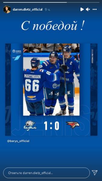 Капитан и защитник казахстанского «Барыса» Даррен Диц отреагировал в своих социальных сетях на победу в матче регулярного чемпионата КХЛ над омским «Авангардом» со счетом 1:0, передает Sports.kz.