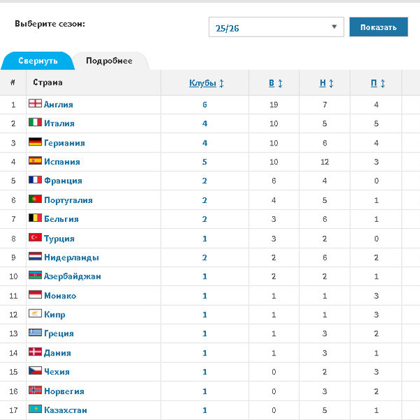 Международный портал Transfermarkt опубликовал рейтинг стран в Лиге Чемпионов сезона-2025/2026, сообщает Sports.kz.