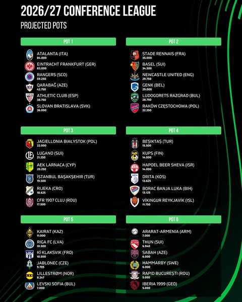 Стали известны предварительные расклады и корзины для общего этапа Лиги Конференций сезона-2026/2027, передает Sports.kz со ссылкой на Football Rankings.