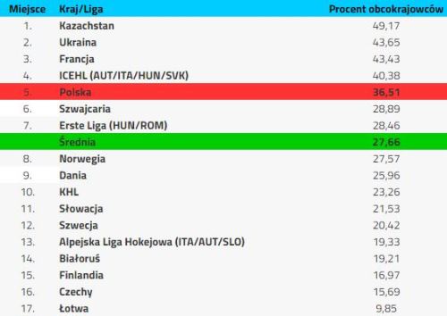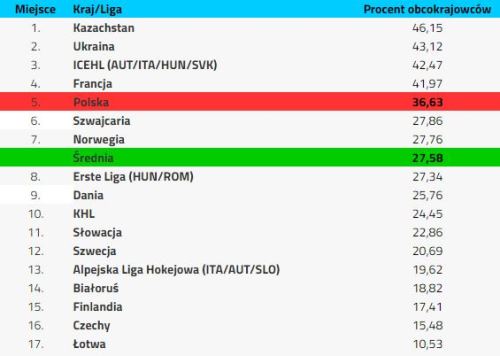 Процент иностранных хоккеистов в Казахстане составляет 46,15%, на втором месте — Украина (43,12%), замыкает тройку рейтинга Австрийская хоккейная лига (42,47%).