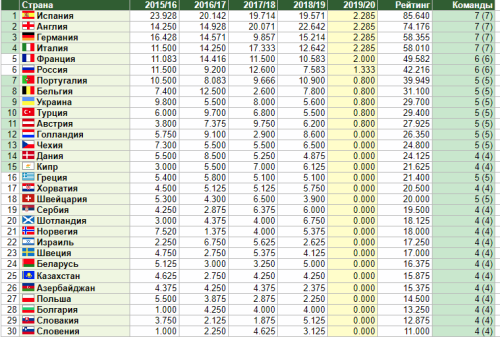 С еврокубкового сезона 2019/2020 коэффициенты клубов стран составляются на основании результатов всех клубов ассоциации в еврокубках с сезона 2015/2016, соответственно набранные очки в сезоне 2014/2015 вычитываются.
