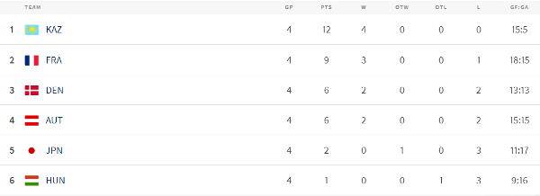 Казахстан обыграл Японию со счётом 3:1, Франция оказалась сильнее Австрии со счётом 7:4, Дания взяла верх над Венгрией со счётом 3:1.