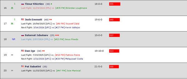 Непобеждённый казахстанец дебютировал в мировом рейтинге ММА по версии американского портала на 18-й позиции. Его соперник — перуанец Хесус Пинедо (25—7—1) — опустился на 23-е место. Исбулаев обогнал в рейтинге чемпиона российского промоушена ACA, а также бойцов UFC Дэна Иге и Пэта Сабатини. Рейтинг полулёгкого веса возглавил двукратный и действующий чемпион UFC Александр Волкановский.