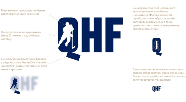 Новый логотип Казахстанской федерации хоккея исполнен с учетом трендов в мировом спортивном графическом дизайне. Логотип QHF демонстрирует уверенность и готовность двигаться вперёд. Буквы аббревиатуры, это сочетание округлой Qсвоими пропорциями символизирующей хоккейную коробку, с жесткими линиями HF. Внутри литеры Q виден силуэт бегущего к зрителю хоккеиста. Характер букв диктует и характер линий в фигуре хоккеиста — сочетание жестких линий и округлых углов соответствует общему настроению аббревиатуры. Символически хоккейная шайба зашифрована в виде хвостика буквы Q — хоккеист находится на дальнем плане, снаряд находится на переднем плане и летит к зрителю.