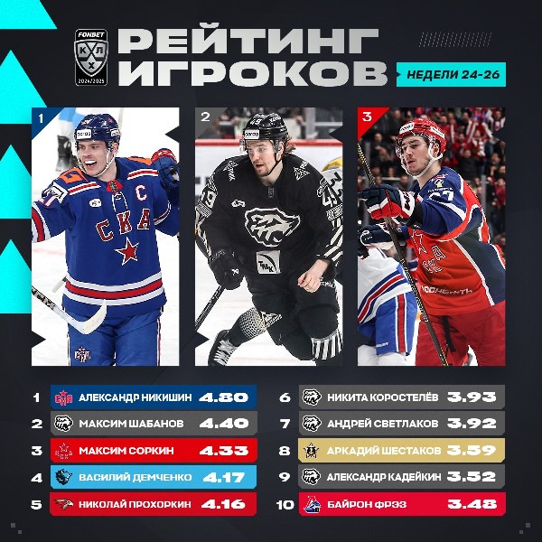 Официальный сайт Континентальной хоккейной лиги представил рейтинг лучших игроков на текущий момент, передает Sports.kz со ссылкой на Shaiba.kz.