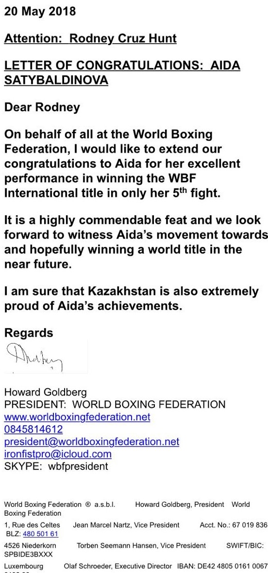 Как стало известно Sports.kz, на имя промоутера казахстанской «GGG среди женщин» (она же — «Леди Спарта») Аиды Сатыбалдиновой Родни Круза Ханта пришло письмо от президента WBF Ховарда Голдберга, в котором отправитель поздравляет подопечную получателя с завоеванием ею пояса WBF International.