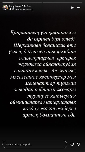«Все три вратаря „Кайрата“ достойны друг друга. У Шерхана большое будущее, но стоит остерегаться слишком рано превращать его в звезду дорогими подарками. Что касается подарков, было бы полезно, если бы бизнесмены и меценаты оказали материальную поддержку игрокам, участвующим впервые в столь высокорейтинговом турнире», — написал функционер в своём инстаграм.