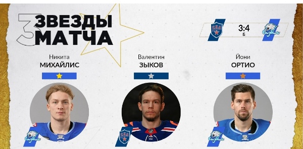Нападающий столичного клуба Никита Михайлис признан первой звездой встречи. Он продолжил результативную серию длиной в шесть матчей, в Петербурге Никита отлично сыграл в большинстве: забил сам и ассистировал Роману Старченко. Реализовал свою попытку в серии бросков.