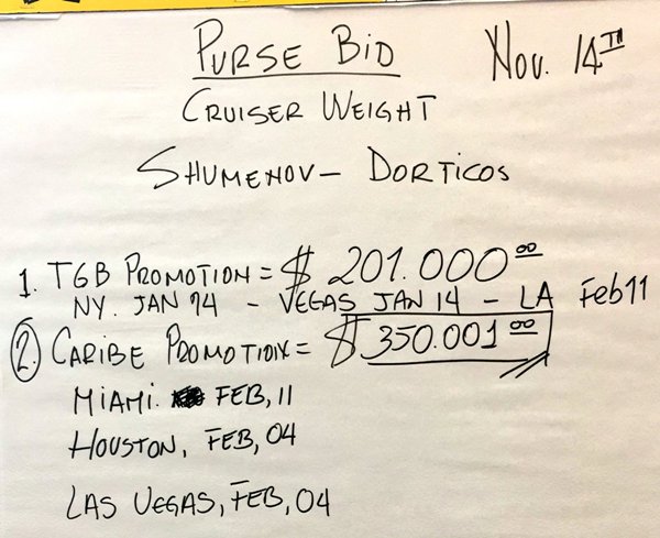 В сети появилось фото записей, сделанных во время промоутерских торгов между TGB Promotions, представляющей интересы казахстанского боксёра Бейбута Шуменова, и Caribbean Promotions со стороны кубинца Юниера Дортикоса, сообщает Sports.kz.
