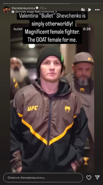 «Валентина „Пуля“ Шевченко просто неземная! Великолепная женщина-боец. Для меня она — величайшая женщина-боец в истории», — написал ирландец в своем инстаграм.