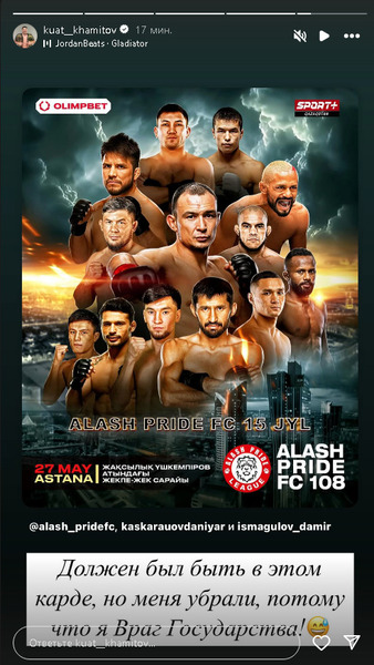 Он выложил постер предстоящего турнира Alash Pride FC 108, который должен состояться 27 мая в Астане.