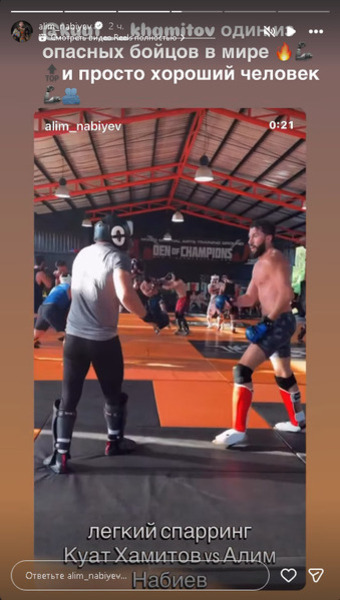 «Куат Хамитов — один из опасных бойцов в мире и просто хороший человек. Лёгкий спарринг: Куат Хамитов против Алима Набиева», — написал «Профессор» в сторис.