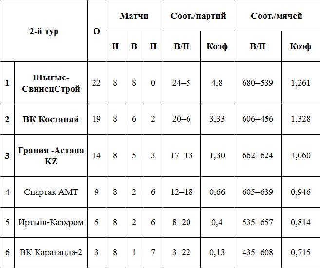 В Усть-Каменогорске проходит второй тур чемпионата страны среди женских команд Высшей лиги «А». После трех игровых дней без поражений идут хозяйки площадки — «Шыгыс СвинецСтрой» и ВК «Костанай». После дня отдыха, в понедельник командам предстоит очное свидание, которое и определит как вероятного победителя тура, так и скорее всего единоличного лидера чемпионата, сообщает пресс-служба ФВРК.