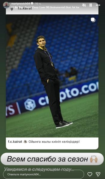 Защитник сборной Беларуси и алматинского «Кайрат» Александр Мартынович опубликовал сторис в социальной сети прокомментировав завершения сезона, сообщает Sports.kz.