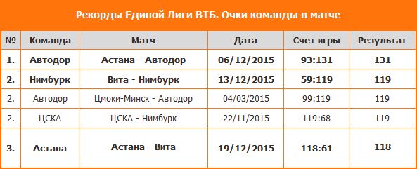 Самой богатой на рекорды стала встреча в Казахстане между местной «Астаной» и грузинской «Витой», где хозяевам удалось отличиться сразу в 5 статистических показателях. Команда Рамунаса Бутаутаса совершила 48 попаданий с игры (1-е место), 36 из которых оказались ценностью в 2 очка (3-е место), набрала 118 очков (5-е место), отметилась 35 результативными передачами (3-е место), а форвард команды Патрик Калатес повторил рекорд Лиги по перехватам (7).