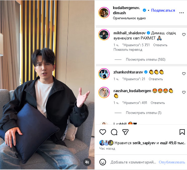 Триумфатор соревнований по фигурному катанию на Олимпиаде-2026 ответил в комментариях к всемирно известному представителю Казахстана, который ранее опубликовал в своём инстаграм-аккаунте пост с обращением к фигуристу, с поздравлением и обещанием подарить ему автомобиль от своего имени. Также Димаш отметил, что его очень порадовало использование Шайдоровым на произвольной программе его песни «Confessa/The Diva Dance».