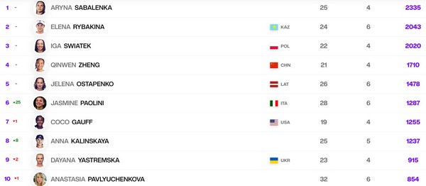 Возглавляет гонку с 2335 очками белоруска Арина Соболенко, на второй строчке Елена Рыбакина из Казахстана (2043), а третья позиция принадлежит польке Иге Швентек (2020).