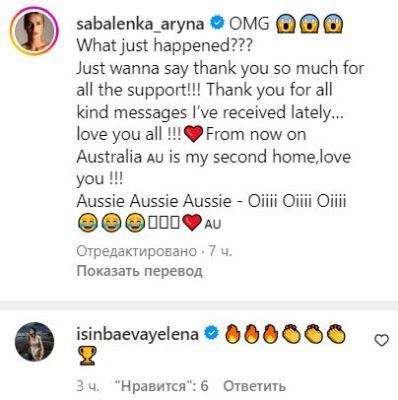 «О Боже! Что это было? Просто хочу сказать вам спасибо за всю поддержку! Спасибо вам за все добрые сообщения, которые я получила... Люблю вас всех! С этого момента Австралия мой второй дом, люблю вас!» — написала Соболенко.