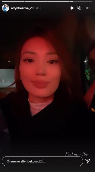 На своей странице в Instagram в разделе сторис Алтынбекова разместила очаровательный снимок из салона автомобиля и оставила короткую подпись: «Почувствуй мой вайб».