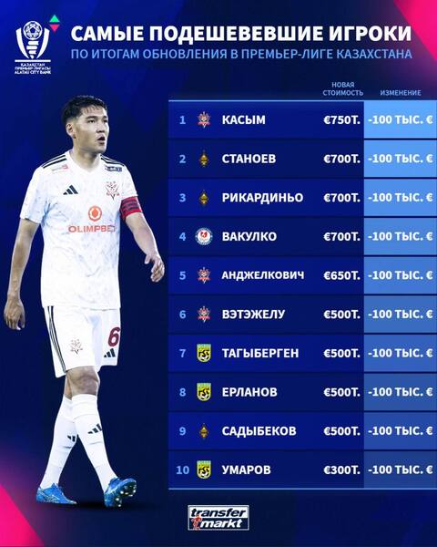 Ряд игроков чемпионата Казахстана заметно потеряли в цене. Первое место рейтинга антироста занял защитник сборной Казахстана и «Актобе» Алибек Касым, который подешевел на 100 тысяч евро и теперь оценивается в 750 тысяч. На втором месте — сербский полузащитник «Кайрата» Юг Станоев. Его трансферная стоимость также снизилась на 100 тысяч евро и составила 700 тысяч. Третью строчку списка занял ещё один представитель алматинского клуба — бразильский нападающий Рикардиньо, чья цена уменьшилась на такую же сумму.