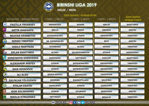 Профессиональная футбольная лига Казахстана представила Вашему вниманию результаты опроса на лучшего игрока и тренера Первенства Республики Казахстан среди клубов Первой лиги в июле.