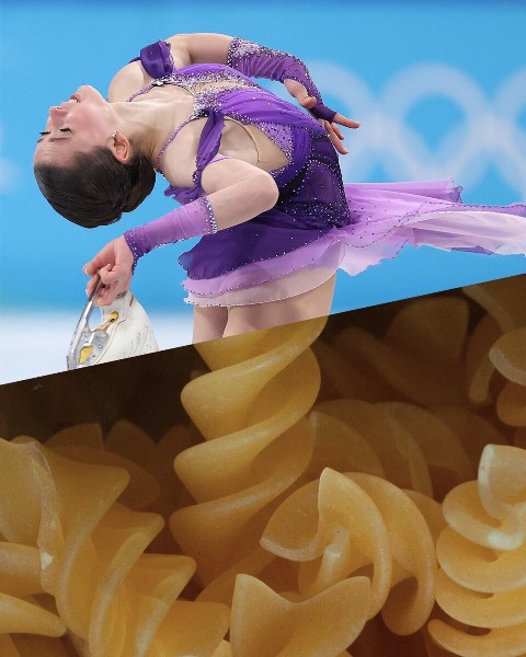 Организаторы Олимпиады разметили пост, посвящённый Всемирному дню пасты, совместив фотографии из различных видов спорта и макаронных изделий. Валиева представила фигурное катание в этом коллаже, её вращение на фото с Олимпийских игр в Пекине в 2022 году сравнили со спиралями фузилли.