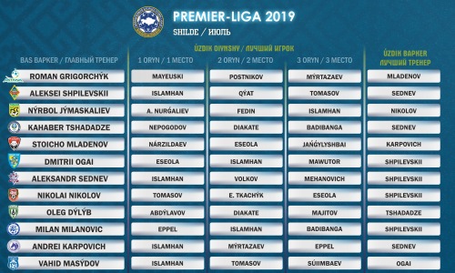 Лучшим игроком июля, равно как и в предыдущем месяце, стал полузащитник «Кайрата» Бауыржан Исламхан. Капитан алматинского клуба в общей сложности набрал 17 очков.