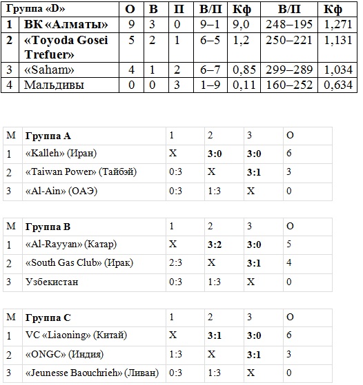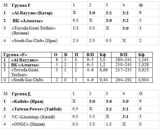 3. «Taiwan Power» (Тайбэй), 4. VC «Liaoning» (Китай), 5. ВК «Алматы», 6.