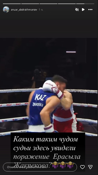 Абдрахманов опубликовал в своем сторис в инстаграм-аккаунте кадры боя между Жакпековым и россиянином Джамбулатом Бижамовым, где видно, как казахстанец доминировал над соперником.