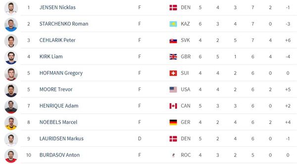 Согласно сайту международной федерации хоккея, казахстанец расположился на втором месте в списке лучших снайперов турнира, столько же очков у датчанина Никласа Йенсена (4+3) и словака Петера Цехларика (2+5).