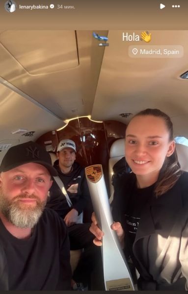 Рыбакина опубликовала фото со своей командой из самолета, подписав его «Hola» (привет по-испански — прим.).