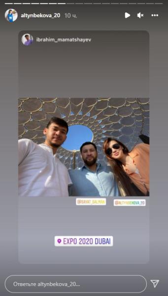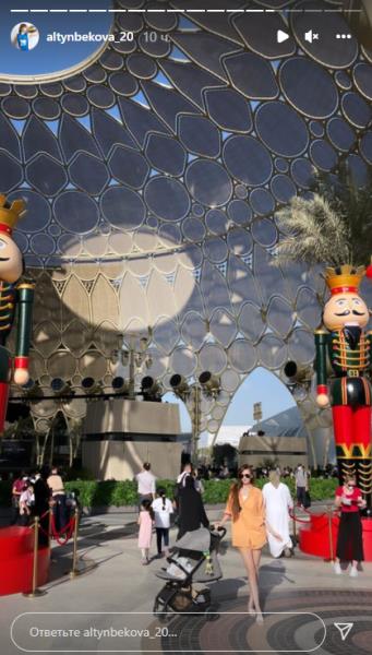 В разделе «сторис» на своей странице в Instagram одна из самых привлекательных спортсменок Казахстана опубликовала новые снимки. Алтынбекова вместе со своим мужем Саятом Салманулы и маленьким сыном посетили всемирную выставку ЭКСПО-2020.