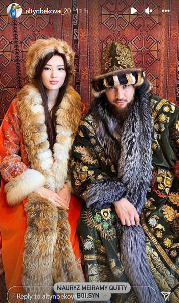 В разделе сторис социальной сети волейболистка опубликовала фотографию со своим супругом, где они оба облачились в национальные казахские костюмы, и оставила описание: «С праздником Наурыз!».