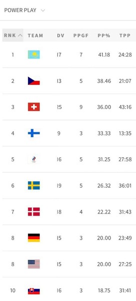 По информации сайта Казахстан занял первое место, обогнав Канаду почти в три с половиной раза, США в два и Финляндию почти на 10 процентов. Казахстанские хоккеисты реализуют 41,18 процентов игры в большинстве, канадцы — 12.50, американцы — 20, а финны — 33.33. Всего казахстанская команда забила семь голов в 17-и моментах большинства. В среднем подопечным Юрия Михайлиса требуется 3 минуты 27 секунд для забитого гола в большинстве.