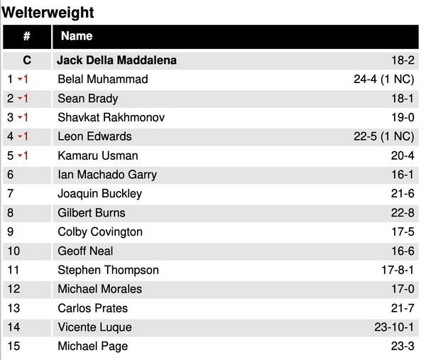 В обновленной версии табеля о рангах UFC в своем весе Рахмонов сместился со второй на третью строчку. Это произошло после того, как Белал Мухаммад потерял титул чемпиона в поединке с Джеком Делла Маддаленой на турнире UFC 315 в Монреале 11 мая. Теперь Мухаммад расположился на первом месте, а вторым стал Шон Брэди.
