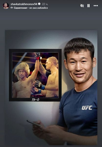Рахмонов запостил в инстаграм свое изображение на фоне кадра с победного боя над файтером из Ирланидии. Сторис сопровождает трек популярного казахстанского исполнителя Скриптонита «Не расслабляйся».