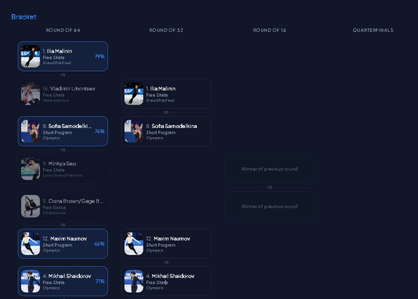 На этапе 1/32 финала голосования болельщикам предстоит сделать выбор между Шайдоровым и американцем русского происхождения Максимом Наумовым, а оппонентом Самоделкиной стал лидер мирового рейтинга из США Илья Малинин.