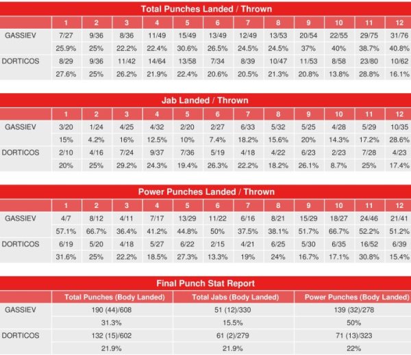 По итогам боя, согласно статистике CompuBox, боксеры нанести примерно одинаковое количество ударов, но Гассиев был более точен: Мурат выбросил 608 ударов, 190 из которых (31,3%) оказались точными (44 из них — удары по корпусу). Дортикос выбросил 602 удара, попав по сопернику 132 раза (21,9% точных ударов, включая 15 ударов по корпусу).