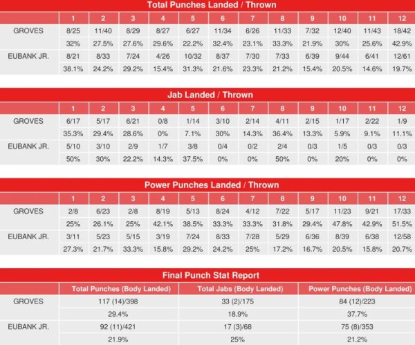 Согласно статистике компании CompuBox чемпион WBA во втором среднем весе Джордж Гроувз превзошел своего соперника Криса Юбэнка-младшего по всем показателям, кроме количества выброшенных ударов.